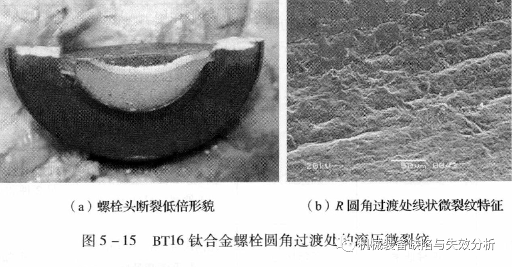 滾壓導(dǎo)致的根部微裂紋一般出現(xiàn)在螺栓頭與螺桿R圓角過渡處,該處由于R尺寸的影響,對于滾壓工藝控制和表面質(zhì)量控制帶來了一定的困難。某BT16鈦合金蝶栓在進行裝配過程中出現(xiàn)低應(yīng)力斷裂。分析發(fā)現(xiàn),在故障螺栓頭和螺桿R圓角過渡處,經(jīng)過滾壓的表面完整性較差,存在大量的周向線狀微裂紋,見圖下圖。