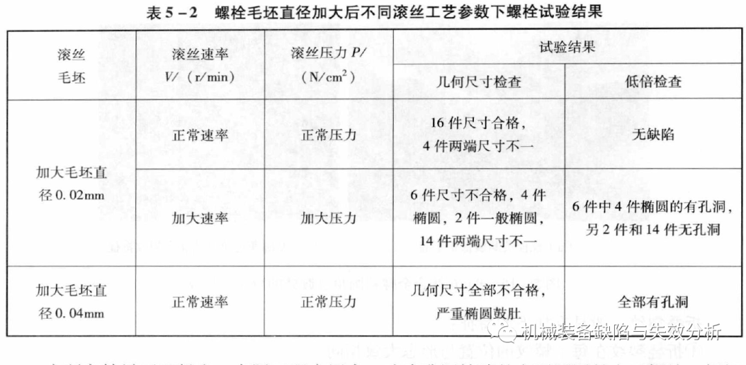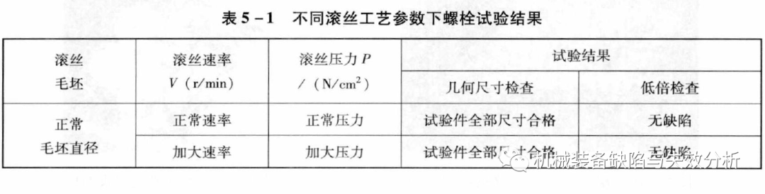 采用正常的滾絲毛坯直徑,經(jīng)正常滾絲壓力和速度、加大滾絲壓力和速度兩種工藝的試驗結(jié)果見下表: