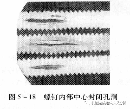 螺釘經(jīng)滾壓導(dǎo)致螺紋端剖面中心開口孔洞見圖5-16;螺釘螺紋端表面中心不規(guī)則孔洞洞見圖5-17;材料塑性好的螺釘出現(xiàn)的內(nèi)部中心封閉孔洞見圖5-18。