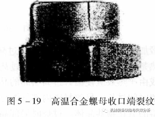 自鎖螺母收口處出現(xiàn)裂紋的現(xiàn)象較為常見,除收口所致應(yīng)力較大外,很多情況下上材料的塑性不良有關(guān),這是由于收口裂紋實質(zhì)上是收口的塑性變形量超過了材料所自受的變形能力。如某型高溫合金自鎖螺母收口處多次出現(xiàn)裂紋,其原因是收口在時效強化后進行,此時由于時效強化導(dǎo)致材料強度高而塑性低產(chǎn)生開裂。后改為先收口后進行時效強化,這一裂紋現(xiàn)象得以解決。