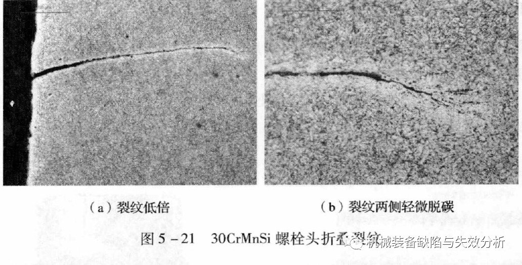 鍛鍛工藝不當或毛坯表面存在未清理干凈的氧化皮也同樣會導(dǎo)致折疊裂紋。這類折疊裂紋當經(jīng)過高溫后,對于鋼來說,一般裂紋兩側(cè)會出現(xiàn)脫碳的現(xiàn)象,而對于鈦合金來說則會出現(xiàn)富氧a層。圖5-21給出了30CrMnSi螺栓頭熱鍛成形導(dǎo)致的折疊裂紋及裂紋兩側(cè)的脫碳形貌。
