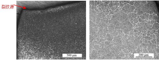 (a) 低倍形貌 (b)裂紋源區形貌