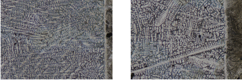 由圖2可知,手持式X射線熒光光譜儀可以直接測出Fe基熔覆層的Cr含量。由于液壓支架活柱、中缸所處礦井環境大多含有腐蝕介質,因此為了提升液壓支架的使用性能,其活柱、中缸可以采用激光熔覆技術制備一層Fe基熔覆層,而要保證熔覆層的耐蝕性要求,熔覆層必須含有足夠多的Cr,故激光熔覆時所用的激光熔覆材料為高Cr不銹鋼Fe基自熔性粉末。然而,激光熔覆過程中熔覆層顯微組織晶界處會析出碳化鉻,當Cr含量不足時,會出現貧鉻區,而貧鉻區往往優先發生腐蝕,并且貧鉻區的Cr含量相比未腐蝕區域偏低。因此,采用手持式X射線熒光光譜儀檢測液壓支架活柱、中缸表面Fe基熔覆層Cr含量,通過對比不同區域位置的Cr含量,初步判斷Fe基熔覆層腐蝕失效的原因。Fe基激光熔覆層腐蝕失效的一個重要原因是工藝匹配不合理,要確定腐蝕失效是否由工藝原因引起,需要對Fe基熔覆層進行組織分析。首先制備Fe基激光熔覆層金相觀察試樣,主要流程為取樣→磨樣→拋光→腐蝕,然后采用金相顯微鏡對金相組織進行觀察。Fe基激光熔覆層顯微組織對比如圖3所示。