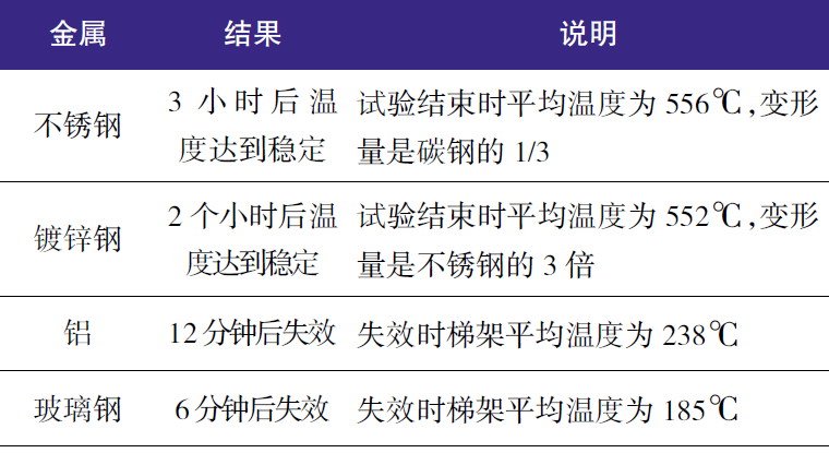 鍍鋅鋼:梯架溫度達到穩(wěn)定用了2 個小時,鍍鋅鋼梯架在2 個小時里保持了其結構完整性。試驗結束時梯架平均溫度為552℃,單個梯架最高溫度為557℃。到試驗結束時,梯架的整個鋅涂層都不見了,盡管當時只看到一滴鋅珠滴落。