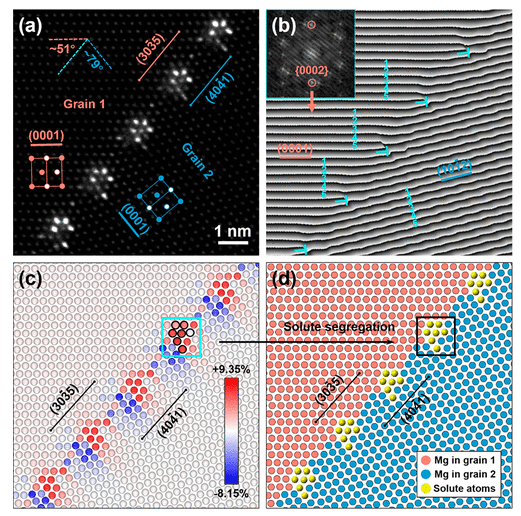 圖2.(a)原子尺度的HAADF-STEM圖像,顯示了沿<112→0>傾斜軸觀察的線性ATGB中的溶質分離。傾斜角度θ 1 = 51°,θ 2 = 79°(I型)。(b)相應的經傅立葉濾波的原始相位圖像,顯示了線性邊界中五個(0001)G1 /(101?2)G2原子層分離的MD的陣列。(c)Voronoi分析圖,顯示壓縮和延伸位點交替分布在純鎂線性ATGB上。(d)I型界面上層結構的溶質離析模型。