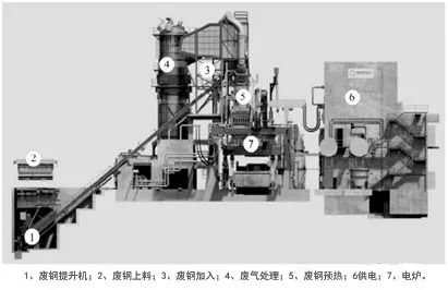 康斯迪電爐(水平加料電弧爐),連續(xù)冶煉,周期較短;不開蓋,無組織排放低;廢鋼預(yù)熱,能效高。但是目前仍然存在可預(yù)熱溫度低,占地大,預(yù)熱通道漏風(fēng)量大,料跨吊車作業(yè)率高,連續(xù)加料槽壽命短及送料槽堵塞,環(huán)境污染等問題。理論值,一爐冶煉周期45min,電耗360kWh/t,電極消耗1.4kg/t。