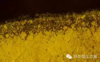 (2)特征,晶界氧化不僅在晶界,在表面也生成氧化物。含Cr的滲碳鋼,由于表面生成鉻的氧化物,在干凈的淬火油中淬火后,可以用肉眼觀察到干凈表面出現淺綠色;用顯微鏡觀察表面時,可以看到晶界氧化呈網狀或半網狀等,淬火組織為貝氏體或屈氏體組織,而非馬氏體組織;工件表面硬度低,殘余壓應力下降。20CrMnTi鋼齒輪滲碳層非馬氏體組織如圖1a、1b所示。