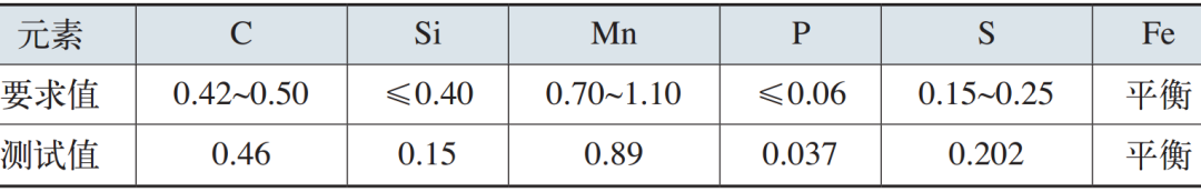 對斷裂的噴油嘴螺栓進(jìn)行取樣,經(jīng)直讀光譜儀進(jìn)行化學(xué)成分分析,結(jié)果如表1所示,顯示螺栓的化學(xué)成分均符合易切削鋼46S20的規(guī)范要求(EN 10277-3:2008)。46S20屬硫系易切削鋼牌號,適用于制造對力學(xué)性能要求不高的各種零件,如螺栓、螺母等。