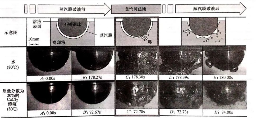 ▲圖7 濃度為20%的 CaCl, 對蒸汽膜破潰的影響圖6 中在純水冷卻曲線上標記為A、B、C、D和E的點表示: