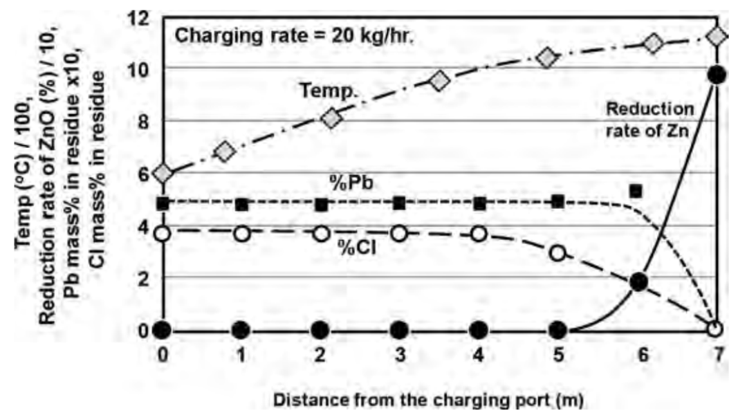 4為爐料溫度、ZnO、Cl、Pb含量隨窯內(nèi)距離的變化規(guī)律。原料從爐子的右側(cè)加入,在移送過程中在爐內(nèi)逐漸加熱,,當(dāng)溫度低于1000℃時,ZnO Cl、Pb氣化現(xiàn)象明顯下降,觀察不到反應(yīng)。當(dāng)在燒嘴火焰下達(dá)到最高溫度時,大部分鋅被還原和蒸發(fā),ClPb也被蒸發(fā)并從靠近燒嘴火焰附近的固體殘留物中去除。