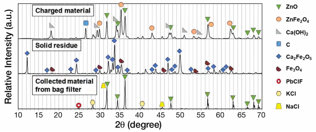 CaO添加技術(shù)中,電爐粉塵以不同比例與CaO粉混合,在空氣中由700℃加熱至1100℃。當(dāng)添加足夠的CaO達(dá)到Ca/Fe摩爾比1.4時,所有的鐵酸鋅在1小時內(nèi)轉(zhuǎn)化為ZnOCa2Fe2O5。理想情況下,鐵酸鋅轉(zhuǎn)化為鐵酸鈣時,鐵/鈣比值是統(tǒng)一的。然而,這些粉塵含有其他礦物,如SiO2、Al2O3等,它們消耗CaO形成化合物。因此,需要過量的CaO才能完成鐵酸鋅的轉(zhuǎn)化。當(dāng)添加CaO時,在1100℃時,電爐粉塵中鹵化物和重金屬的蒸發(fā)優(yōu)先發(fā)生。