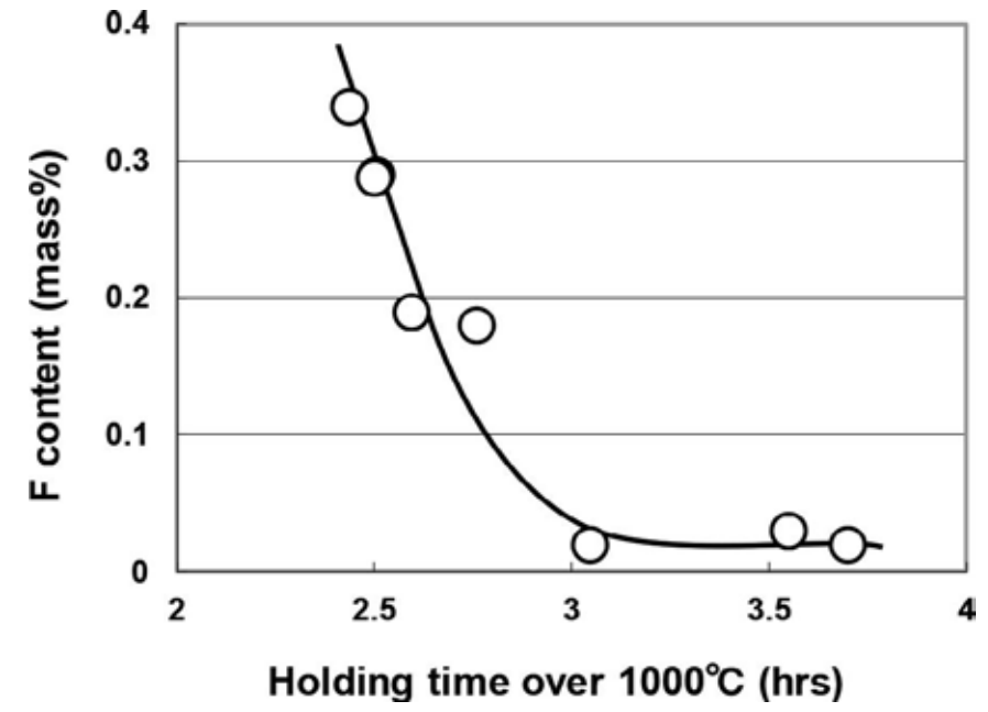 固體殘渣中F含量隨窯內(nèi)保溫時間的變化