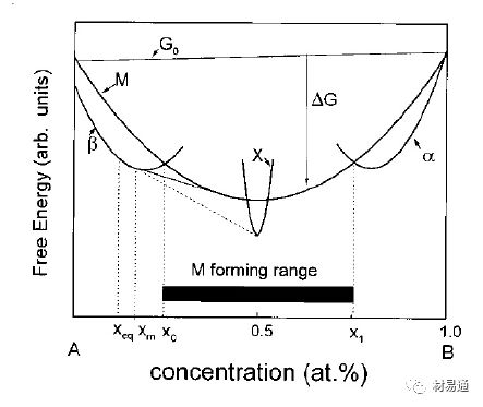 根據(jù)自由能圖,可以估判非晶形成的成分區(qū)域、非晶形成能力、非晶形成驅(qū)動力。非晶相在等成分附近相比晶態(tài)相具有較低的自由能,因而在相競爭過程有優(yōu)勢。從相圖來看,合金體系是否存在深共晶點和該體系的非晶形成能力密切相關(guān),在非平衡條件下,合金體系易形成深亞穩(wěn)共晶點,使得體系具有非晶形成能力。