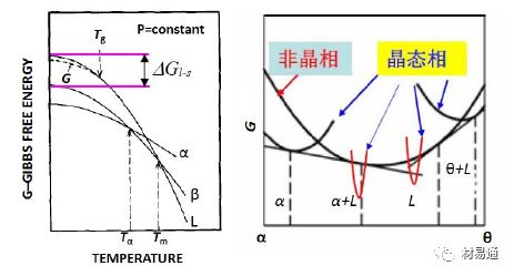 體系無序非晶相和其它晶態(tài)相的自由能對比圖(右)。