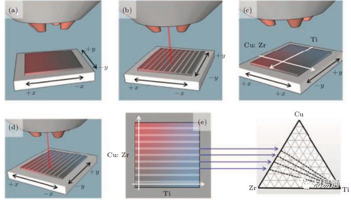 激光沉積法利用了金屬激光增材制造中的同軸送粉技術(shù), 其原理如下圖所示。噴嘴與不同的粉末材料源連接, 通過激光熔融在襯底上噴涂不同材料的涂層, 通過控制各個噴組的送分量可以控制成分的變化及范圍。之后用激光對涂層進行重熔, 從而獲得厚度方向成分均勻而水平方向有成分梯度的組合材料庫。通過控制激光功率和脈沖時間可以對冷卻速率進行控制。