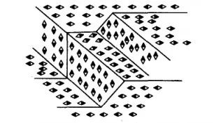 這些磁區叫做磁疇,體積約為10E-6mm3含有約10E15個原子;寬度為0.01-0.1mm,原子有10萬個以上。每個磁疇內原子的磁矩平行排列,皆有一個永久磁矩。磁疇和磁疇的邊界叫做疇壁。疇壁的厚度約0.1μm,有約1000個原子層,其取向為從一個磁疇磁化方向逐步向另一磁疇磁化方向的過渡,如圖5所示。