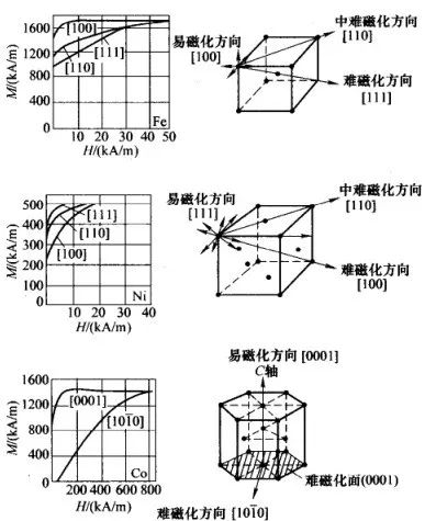 由于晶體的各向異性,鐵沿[100]、鎳沿[111]、鈷沿C軸方向磁化,在最弱的磁場中也可達到磁飽和,即達到磁飽和所需的磁場能最低值。這些方向為易磁化方向。而鐵的[111]、鎳的[100]、鈷的六方底面(0001)的各方向為難磁化方向。沿不同晶向磁化的難易程度不同,即所需能量不同的現象叫做磁晶各向異性。沿難磁化和易磁化方向磁化的磁化功的差稱為磁晶各向異性能,其大小等于該兩晶向磁化曲線所包圍的面積。為了使磁能量最低,磁疇自發磁化趨向于易磁化方向,而鐵磁體沿易磁化方向的磁性最好。