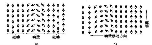 鐵磁體在完全退磁狀態下,磁疇的磁化方向混亂分布,磁矩完全相互抵消,因而材料在宏觀上不顯示磁性。當施加外磁場時,那些磁化方向平行于外磁場的磁疇,以由原子磁矩轉動所引起的疇壁移動的方式(見圖7),吞并反向磁疇而逐漸長大,最后使整個磁疇沿磁場方向排列。在去除外磁場后,如果磁疇的取向不能恢復