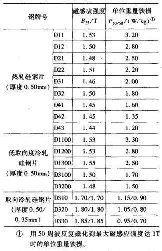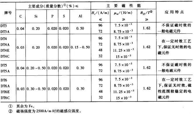 電工用純鐵有原料純鐵(DT1、DT2)、電磁純鐵(DT3、DT4、DT5、DT6)和電子管純鐵(DT7、DT8)等三種。它們的飽和磁感應強度高,磁導率高,矯頑力小,但電阻率低,鐵損較大,是應用最早、易于加工和最便宜的軟磁材料和原料。應用最廣的為電磁純鐵,一般用于制造鐵心、磁極、銜鐵、磁屏等,它的成分、性能和應用特點見表1。