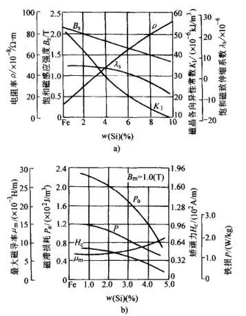 電工用硅鋼實際上就是工業純鐵中含w(Si)1%~4.5%的鐵硅合金。它在室溫下具有含硅的單相鐵素體組織。硅溶于鐵中形成置換固溶體,引起晶格畸變,使電阻率增大,渦流損耗減少。晶格畸變也使矯頑力增大,但因硅鋼在高溫下可獲得粗大晶粒,且冷卻時無相變引起的晶粒細化,所以總結果仍使矯頑力降低。另外,硅能促進碳的離析并與氧化合,減輕碳、氧在鐵中間隙固溶的強烈有害作用,增大磁導率,使磁化變得比較容易,并降低磁滯損耗;同時因減小了磁時效傾向,也提高了磁性能的穩定性。硅對磁性能的影響如圖14 所示。但硅的加入使鋼的脆性增大,導熱性降低,使材料的成形加工性能變壞,所以含量一般不超過w(Si)4.5%。
