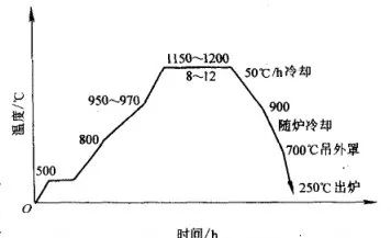 (4)成品退火,通常在電熱罩式爐中的氫氣、保護氣氛或在真空下進行,溫度為1150~1200℃或更高。在950~1100℃范圍內控制加熱速度,使雜質的溶解速度與(110)[001]取向晶粒的長大速度相適應,發生(110)[001]的擇優長大。通過這樣的二次再結晶,獲得完善的、高取向度的高斯織構,并在更高的溫度下去除雜質,得到粗大晶粒。典型的工藝制度如圖16 所示。