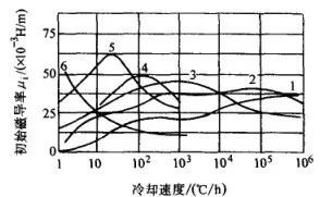 在有序化轉變溫度范圍(600~400℃)內,冷卻速度尤須適當,以使K值和λ值趨近于零或足夠小,得到盡可能高的磁導率μ。圖22示出不同成分的Ni-Fe-Mo合金磁導率與退火冷卻速度的關系。它表明隨合金中鋁含量的增加,對應于最大初始磁導率的最佳冷卻速度降低。這是鉗阻止FeNi,有序相形成的結果。