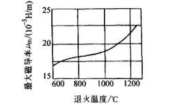 ▲圖19 w(ni)45%的鐵鎳合金的磁導率與退火溫度的關系