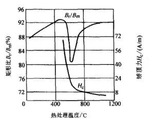 ▲圖21 退火溫度對Ni79Mo4合金矯頑力和矩形比的影響