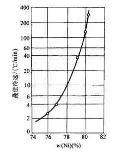 圖23 示出Ni-Fe-Mo合金的鎳含量對最佳冷卻速度的影響。可見鎳含量越高,獲得高磁導率的冷卻速度越大。一般,對于w(Ni)<65%的合金,由于有序化轉變不明顯,冷卻速度的作用不大,允許采用較快的冷卻速度,但以不引起較大內應力為原則。