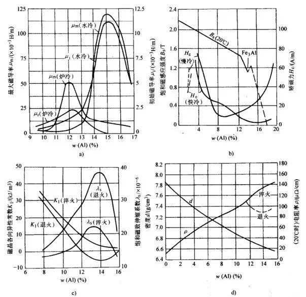 ▲圖28 鐵鋁合金主要磁性能以及有關性能(分圖a、b、c、d)隨鋁含量的變化