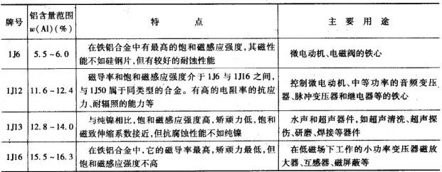 按照性能特點和用途,我國生產的鐵鋁磁性合金主要有四種牌號,其鋁含量范圍、特點和用途見表5;主要性能見表6。