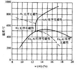 w(Al)<34.4%的鐵鋁合金在高溫下的組織皆為含鋁鐵素體。在這個成分范圍內,隨鋁含量和溫度的變化,合金中發生FeAl和Fe3Al的有序轉變和磁性轉變(見圖27)。改變成分和進行熱處理,可以顯著改變鐵鋁合金的磁性能。圖28顯示主要磁性能的變化。