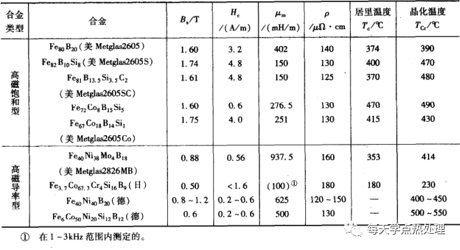 ①高磁感應強度的非晶態軟磁材料,主要是Fe-B系或Fe-B-Si系合金,為了提高磁導率和磁感應強度,并降低矯頑力,加入一定量的Co,這類合金多用于電力變壓器和電機,以及電源變壓器、開關電源、脈沖變壓器和電抗器等;