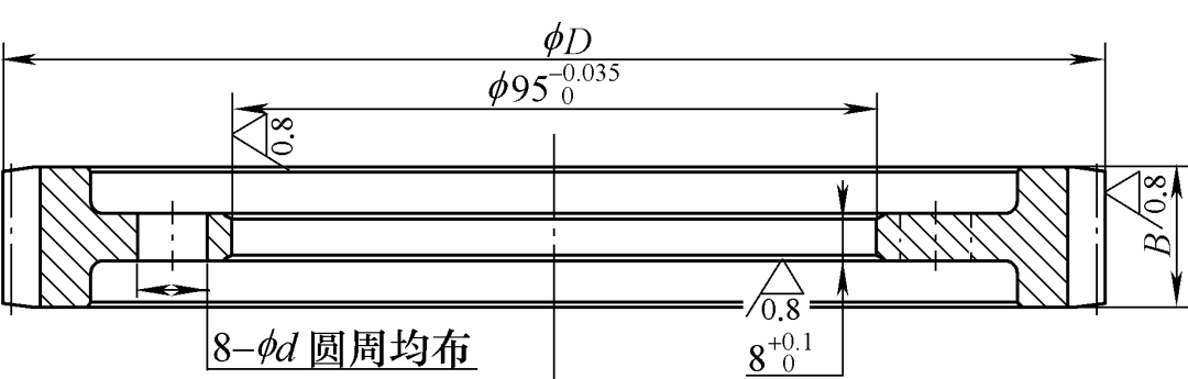 對此,我們設計了一個環形墊圈作為齒輪滲碳專用工裝,環形墊圈簡圖如圖4所示,該工裝加工制作簡單方便,生產成本低。采用另外一種滲碳擺放方式與環形墊圈配合使用,該擺放方式示意圖如圖5所示。
