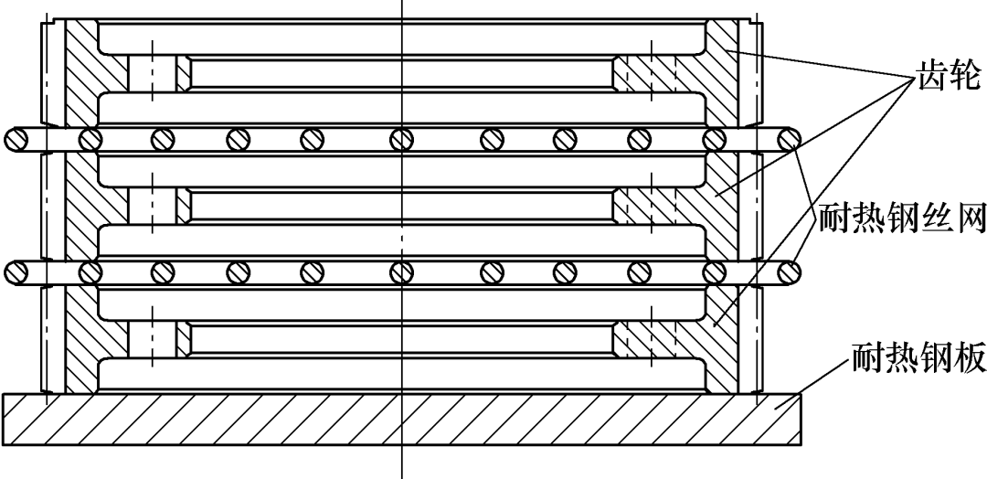 其次,察看現場情況,發現裝料方法有問題。主要是裝料工裝料擺放不合理,齒輪堆放過密。裝料方法不合理對熱處理畸變有著重要影響。該滲碳擺放方式示意圖如圖3所示。齒輪平放在蜂窩狀的方形耐熱鋼板上,齒輪擺滿一層后上面鋪上耐熱鋼絲網接著再擺放2層齒輪。經過分析,貼近耐熱鋼板和鋼絲網的齒輪端面在滲碳淬火過程中,齒輪的上、下端面升溫、降溫、淬火時溫度不均勻,滲碳氣氛擴散循環不暢、滲碳速度快慢不一致,且有滲碳死角,淬火油流動不暢,冷卻速度不一致,這是導致齒輪有效硬化層深度和端面部位硬度、心部硬度不均勻的主要因素;再加上高溫下滲碳時零件堆放過密,齒輪機加工應力、熱應力、組織應力、齒輪自重和工裝的重量相互疊加這是誘導齒輪端面蠕變而翹曲變形的另一原因。