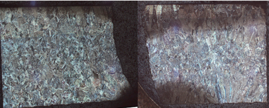 將斷口試樣從中間對半剖開進行金相分析,如圖3所示。觀察發現,右側斷口上部存在焊縫區域,下部有柱狀晶特征,左右兩側斷口上部及下部均存在一定的熱影響區,缺陷附近存在明顯焊接特征。