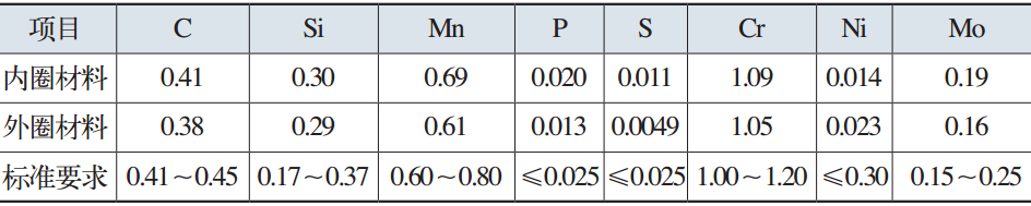 分別從軸承內外圈切取30mm×30mm×30mm試塊,表面經砂輪打磨后用直讀光譜儀測試軸承內外圈材料的化學成分,結果如表2所示。與GB/T29717—2013《滾動軸承風力發電機組偏航、變槳軸承》對照,軸承內外圈材料碳含量及主要合金元素含量均與42CrMo鋼符合。