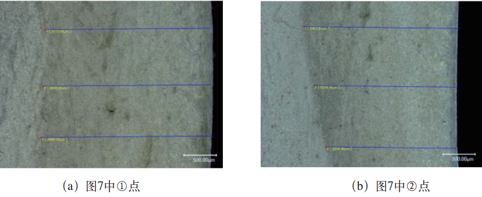 用數碼顯微鏡觀察淬硬層的低倍金相組織,如圖8所示。分別測量圖7中各點的淬硬層深度,結果如表3所示。