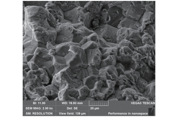 用掃描電鏡(SEM)觀察分析軸承內圈斷口(裂紋)的顯微形貌,圖2中的疲勞源A區SEM形貌如圖18所示。放大后可見該疲勞源區微觀形貌呈典型的沿晶斷裂特征,如圖19所示。