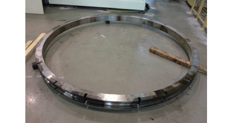 易孚迪感應加熱設備(上海)有限公司自行研發設計針對風力發電行業轉盤軸承感應淬火機床并已經大量在用戶現場使用。為保障設備高精度和穩定性,設備系統硬件采用840D SL 數控系統,NCU720.3 PN(V3.2)版本。該設備可以針對重達10t、最大工件外徑6m的轉盤軸承進行熱處理。老式的轉盤軸承感應加熱設備一般通過人工手動找加熱位置,且在加熱過程中無有效的跟蹤方式,導致工件變形嚴重,極大地影響了產品質量和使用壽命。我公司針對老式設備的缺點,采用西門子840D SL系統自帶的探頭功能來處理全自動精確找加熱起始位置,且在整個加熱過程中通過系統快速模擬量功能來實時跟蹤加熱感應器與工件的距離,然后通過NC程序高精度動態響應進行伺服軸補償的原理,以保證整個加熱過程中感應器與工件之間的間隙保持一致,從而保證整個工件熱處理工藝的穩定性。