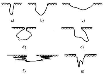 點蝕性能評定時失重法應用最廣泛,用點蝕率[g/ (㎡·h) ] 或平均腐蝕速度(mm/a) 表示。圖1 所示為美國 ASTM G46-1994點蝕試驗標準中,按蝕孔密度、尺寸和深度的評定標準。圖1 所示為蝕孔斷面特征。