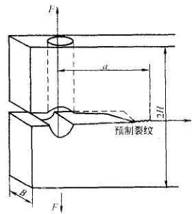 3.2.2.2 斷裂力學法 采用三點彎曲或四點彎曲加載或拉拉反復加載,測定腐蝕疲勞裂紋擴展速率()與應力強度因子(?K) 曲線,判斷腐蝕疲勞行為,進行壽命預測與估算。采用薄板狀裂紋試樣,試樣浸泡在腐蝕介質中時缺口向下。裂紋長度可用直流電位法,交流電位法或光學顯微鏡跟蹤測定。通過斷裂片測出的直流電位(?V) 與裂紋長度(a)的關系如下式,誤差小于5% 。