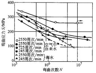 (2) 普通大氣介質下材料的疲勞強度不受載荷頻率的影響,而腐蝕疲勞強度與頻率有密切關系,隨頻率降低,腐蝕疲勞強度下降。