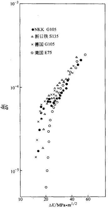第Ⅲ階段是 da/dN隨AK增加而加速擴展,當Kmax=KC時發生斷裂。圖23是石油鉆桿用鋼在pH值為10~11的介質中的曲線。