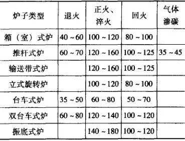 選擇熱處理爐型時,應根據熱處理件特點、工藝要求和批量,合理選擇爐型。以下是幾種常用的爐型選擇:(1) 汽車齒輪類滲碳零件,大批量生產時,一般選用推桿式連續滲碳淬火自動線;中批量生產時,選用密封箱式爐組成聯動線;小批量生產時,應優先選用密封箱式爐完成滲碳淬火,盡量避免使用井式滲碳爐,以避免工件在空氣介質中入油淬火帶來的表面氧化脫碳。(2) 軸承類零件,根據零件大小,一般選用輥底式爐、鑄鏈式爐、推桿式爐或網帶式爐組。成自動生產線;而滾珠多選用鼓形爐組成的自動生產線。(3) 長軸件,大批量時,選用輥底式爐生產線(也可選用感應加熱淬火回火自動生產線);小批量時,選用井式爐或臺車爐。(5) 中小標準件,選用鑄鏈爐、網帶式爐、振底爐。(6) 工具、模具、刃具,優先選用真空爐,也可選用流態粒子爐、鹽浴爐。(7) 鋼帶等退火件,推廣應用保護氣氛罩式爐、井式爐和箱式爐。熱處理爐生產率是指某熱處理爐在1h 內可完成某熱處理工序零件的重量,即kg/h。它與爐型、功率、爐膛尺寸、工藝類型、零件裝夾方式等因素有關。幾種爐型單位爐底面積的平均生產率見表5。平均生產率是指熱處理爐在一般正常生產條件下所達到的生產率。熱處理爐產品樣本所標出的生產率數值,通常是指該設備可能完成的最大生產率。車間設計時,應根據零件或代表產品實際排料計算設備的平均生產率。幾種典型設備的平均生產率按如下方法計算: