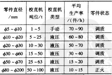 集油槽的容積(m3) : V2= (V1 +全車間循環淬火油槽總容積)×1.2 (3) 清洗設備。清洗設備有連續式、室式、槽式等清洗機和清洗槽。多數清洗機是與加熱淬火設備配套使用的,作前清洗或后清洗用。應根據多數熱處理件的批量和加熱淬火爐的操作方式選擇。(4) 清理及強化設備。清理及強化設備主要用于清理零件熱處理后表面的氧化皮或進行表面強化用。該設備(如噴丸機、酸洗槽、清理滾筒)多有粉塵、酸氣、噪聲等污染環境物,因此,多數獨立設置。可按處理量計算所需的設備量。(5) 校直設備。熱處理后的彎曲工件需要用手動或機械校直。小型零件用手動螺旋壓床或齒條壓床,中型、大型零件用液壓機。一般零件所需校直機的參數見表13。
