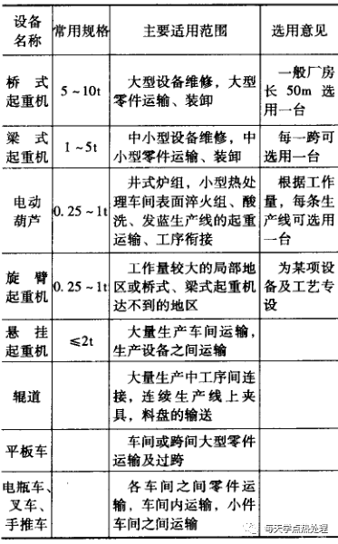 (6) 起重運輸設備。起重運輸設備應根據設備安裝、修理、工藝所需起吊運輸最大重量以及工藝平面布置確定,起重運輸設備的適用范圍及選擇原則見表14。