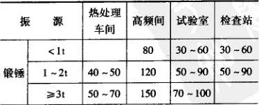 熱處理車間產生有害氣體,如蒸汽、油煙、粉塵等,應位于機加工、裝配等車間的下風向(按項目建設地主導風向)。一般車間考慮采光、自然通風要求的間距要滿足消防、環保等現行規范的要求,同時應≥10m。近年隨著鋼結構廠房的推廣應用,對少、無污染的熱處理車間也可與機加工、裝配車間組建成聯合廠房。熱處理車間應與鍛造車間、鐵路等保持一定的防振間距,或采取相應的隔振措施。防振間距見表16。
