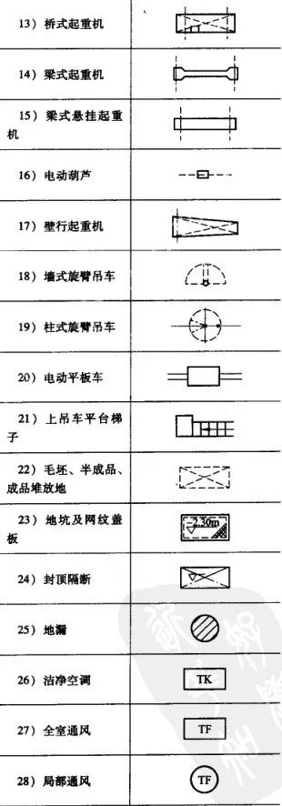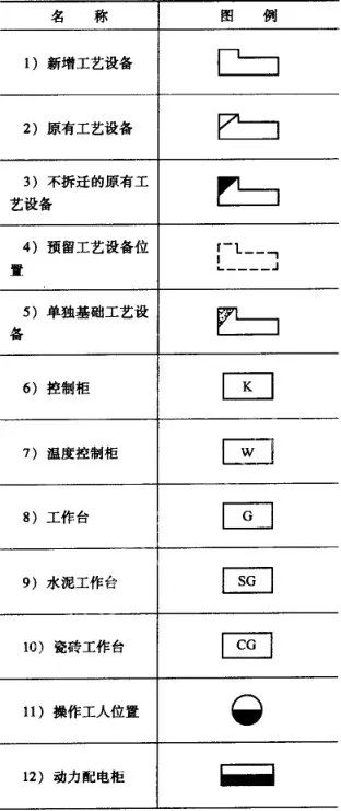 車間平面布置圖中所用的圖樣、圖例可參考表17所示樣式。