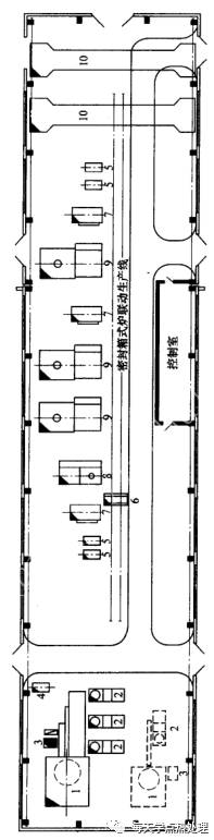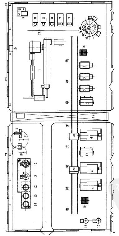 1一連續式氣體滲碳淬火回火自動線 2一井式回火電阻爐 3-井式滲碳爐 4一密封箱式爐 5-一箱式同火爐 6-轉底式光亮淬火爐 7一芯軸淬火裝置 8一鋅火壓床 9-循環油植 10一檢驗平臺 11一校直機 12一淬火油槽 13一堿洗槽 14一清洗槽 15一吸熱式氣氛發生器16一備料臺 17一清洗機 18一橋式起重機 19一平衡吊 20一推拉料小車 21-手動單軌吊車